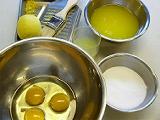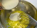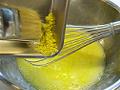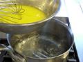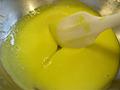 湯煎からはずしたクリームに熱い溶かしバターを少しずつ加えながら混ぜる。