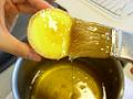 水を加えて煮溶かした熱いナパージュをぬる。表面がつるっと仕上がるように刷毛を大きく動かす。