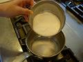 キャラメルがとびはねて火傷しないように、粉ふるいやザルでカバーする。