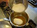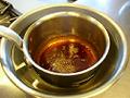 好みのキャラメル色になれば、粉ふるいやザルを通してぬるま湯を少しずつ入れる。