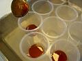 用意した型にキャラメルを分けて入れる。カップの周りにキャラメルが付いた時は固まってから取る。