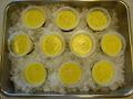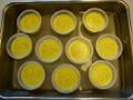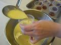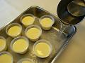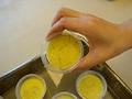 準備したキャラメルの表面が固まっていれば、プリン種を等分して入れる。
