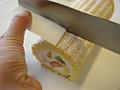 紙をはずし、全体に粉砂糖を振り、温めた包丁を使って3cm幅に切り分ける。