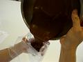テンパリングしたクーヴェルテュールをチョコレート用の型一杯に流し入れる。