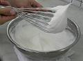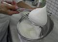 ピンと角が立つ状態になったら最後に泡立て器ですり混ぜるようにしてきめ細かいしっかりとした状態に仕上げる。