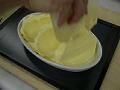 温めたグラタン皿に、カードで生地を大きくすくって入れ、3つの山形に成形する。