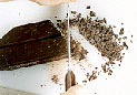 チョコレートは水気を嫌う。波刃の包丁などを使うと分厚いチョコレートも刻みやすい。