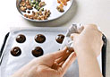 クーヴェルテュールが固まりきる前に、準備しておいたナッツやドライフルーツを上に置いていく。