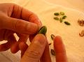 沸騰した湯の中にピスタチオを入れ、皮を湯むきして乾燥させる。