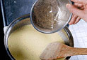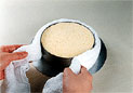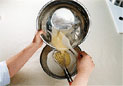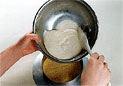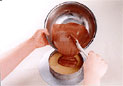 生地を敷いた型の中に流し表面を平らにし冷蔵庫で冷やし固める。