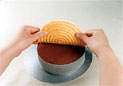 表面には砂糖をふって焼いたビスキュイを、焼き目を下にして15cmのリング型に敷き込む。