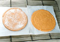 オーブンプレートの大きさに合わせた紙に、直径15cmの円を描く。直径9mmの丸口金を着けた絞り出し袋に生地を入れ、円の少し内側まで渦巻き状に絞って砂糖を全体に振る。もう一枚同様の大きさに絞る(砂糖は振らない)。