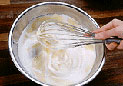 泡立て器ですくい上げるようにしてボウルも手前に回しながら手早く混ぜる。生クリームが冷たいので早く混ぜないとベースが冷え固まってくるので注意。