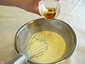 卵をほぐし、塩とグラニュー糖を入れ、グラニュー糖が溶けたら生クリーム、カルヴァドス酒を加えて軽く混ぜる。