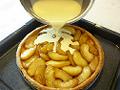 空焼きしたフイユタージュにりんごのキャラメリゼを重ならないように並べ、アパレイユを流し入れて180℃のオーブンで30〜40分焼く。