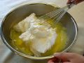 粗熱の取れたカスタードクリームとイタリアンメレンゲを泡をつぶさないようにさっくりと混ぜ合わせる。