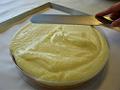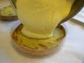 アパレイユとりんごを詰めて焼いたタルトケースが冷めたら、その上にタルト用セルクルをもう1つのせて重ねるか4cm高さになるようにフィルム(硬いもの)を巻きつけ、でき上がったクレーム・シブーストを流し込む。