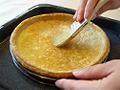 焼き上がりの判断:揺すってみてアパレイユが固まっているかを確認する。判りにくければ中心部分に竹串などを刺してみて液体が出てこないかどうかを確認する。