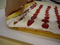 いちごを縦半分に切り、全体に並べる。巻き始めのラインのところにもいちごを並べ、しっかりと芯を作る。