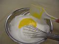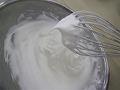 卵白をほぐし、グラニュー糖を数回に分けながらメレンゲを作る。メレンゲの角が軽く曲がるような少し柔らかい状態。