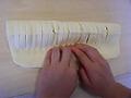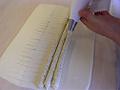 生地がしっかり冷えた状態で落とすように切ります。切った断面がくっついてしまうときれいに膨らみません!
