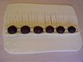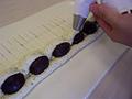 クリームを絞る。切り込みの部分ぎりぎりのところから手前に丸口金の13mmの太さで3本絞る。