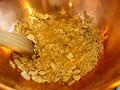 鍋で水あめとグラニュー糖を火にかけ、薄くキャラメル色になるまで煮詰める。