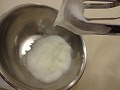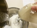 ハンドミキサーの筋が出てきたら、10gの砂糖を加え、泡立てる。
