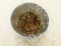 レーズンの表面にラップを密着させ、さらに器にラップをはるか、ビニールに入れて中身が漏れないようにする。