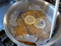 鍋に、水・砂糖・レモンの輪切り・バニラのさやを裂いて出した種と、残ったさやも入れ、沸騰させる。