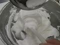 泡の様子を見て、少しずつ砂糖を加え、さらに泡立てる作業を繰り返し、しっかりしたメレンゲを作る。