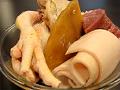 ひね鶏、豚肉はぶつ切りにし、鶏の足は爪を切り落とし、鶏の足の皮をとる。中国ハムの皮は適当な大きさに切る。ひね鶏〜豚の皮までをそれぞれ熱湯でゆでてアクをだし、丁寧に水洗いする。