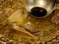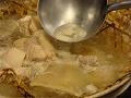 土鍋に竹網を敷き、3の肉類を半量入れ、アワビを入れ、上に竹網をのせ、残りの肉類を入れ、スープ5Lを注ぐ。