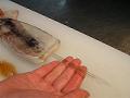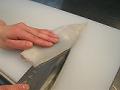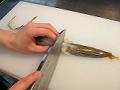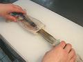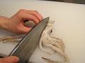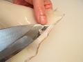 軟甲のあった部分に包丁をさし入れ、切り開く。
