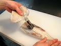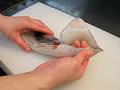 ひれを取ったあたりのはがれた皮をつまみ、そのまま引っぱってはずす。胴の中に残った内臓を取り、水の中できれいに洗う。