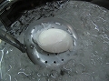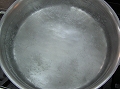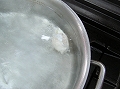 浅手の鍋に湯に沸かし、酢を入れて、液体の表面がことこと踊っている火加減にする。