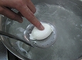 水の量は卵を立てた時の1.5倍くらいの深さにします。また、湯の量に対して5%の酢を入れます(1Lの湯に50mlの酢の割合です)。