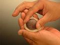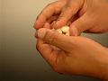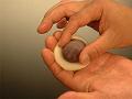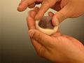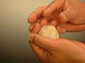 餡玉の両端を右手で軽く押さえ、餡玉の丸い形を潰さないように注意する。