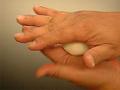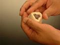 左手で生地を回しながら指先を曲げ、餡玉に生地を貼り付けると同時に人差し指と小指で生地の両端を支えるように持ち、生地を少しのばし、厚みをそろえる。