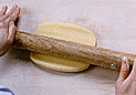 同じ向きで伸ばし続けると生地が台にくっついてしまう。大きく伸びたら、麺棒に巻き取って向きを変えると良い。