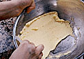 台にくっつかないように打ち粉を使いながら、めん棒を前後に転がして伸ばす。