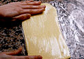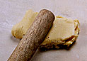 冷やし固めた生地をめん棒で叩きながら伸ばしやすい固さにそろえる。