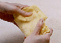 平たくして冷やし固めた生地をまず手で軽くまとめるが、あまり手でさわりすぎると生地が柔らかくなりすぎて伸ばしずらくなるので、めん棒などを使って固さを整える。