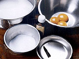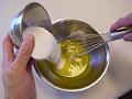 ボウルに卵黄を入れて泡立て器でほぐし、グラニュー糖を一度に加え、少し白っぽくなるまで混ぜる。