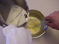 混ぜ方が悪かったり火を入れすぎたりすると、このように(卵の)かたまりができるので注意すること。(舌触りは悪くなるが)かたまりが小さなうちに気がつけばすぐにボールに移し、熱をとりながら泡立て器で勢いよく混ぜれば、ザラツキをおさえることができる。
