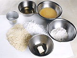 オーブンを200℃に温める。薄力粉、タン・プール・タンをよく混ぜ合わせてふるう。バターを湯煎で溶かす。プレートより一回り大きな紙(クッキングシート)を用意し、四隅に切り込みを入れ、角を重ね合わせてオーブンプレートに敷き込む。