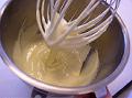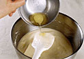 ボウルに卵を割りほぐし、粉類を加えて混ぜる。全体が白っぽくふんわりとしてくればよい。