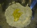 中央をくぼませ、卵黄、冷水、塩を混ぜたものを入れる。