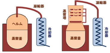 単式蒸留装置(左)と連続式蒸留装置(右)の簡略図