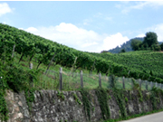 日当たりの良い斜面を利用したブドウ畑。 右手前は車道。
